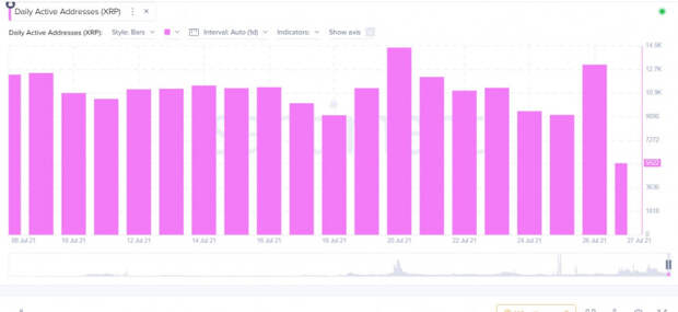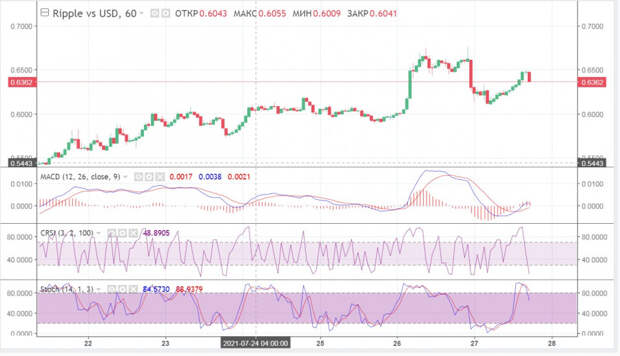 Токену Ripple не удалось в полной мере воспользоваться бычьим зарядом рынка и начать восходящее движение. Криптовалюта успешно пробила линию нисходящего сопротивления и по состоянию на 16:00 котируется на отметке 0,64$. При этом основные индикаторы актива подают признаки бычьего прорыва, но XRP по-прежнему не удалось начать мощный рывок. Ближайшая зона сопротивления расположена на отметке в 0,7$, после чего следует движение к круглой отметке в 1$. Однако ончейн-показатели актива свидетельствуют о крайне низком интересе к криптовалюте. Дневная активность уникальных адресов в сети токена просела до 5,5 тысячи. За предыдущий день, 26 июля, этот показатель приближался к отметке в 12,7 тысячи. Это указывает на недооценку криптовалюты, связанную с судебными разбирательствами между SEC и Ripple. Рынок перестал реагировать на позитивные новости из зала суда. Это указывает на то, что игроки будут ждать завершения судебного разбирательства, прежде чем делать основную ставку на коин Ripple. Учитывая наличие более перспективных альткоинов, XRP/USD понадобится как минимум неделя для преодоления отметки в 1$.