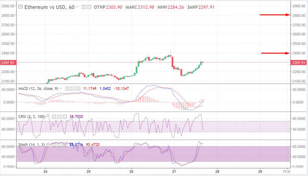 Локальная динамка изменения цены остается позитивной (+1,7%), а индикатор MACD миновал нулевую отметку и начинает расти. Индикатор RSI находится на отметке 40, а стохастический осциллятор сформировал бычье пересечение, хоть дальнейшая динамика еще не ясна. Если ETH удастся пробить локальную зону поддержки, то видимых препятствий на пути к следующему рубежу 2,8$ тысячи у актива не предвидится.
