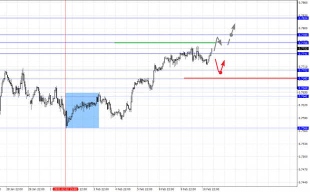 Краткосрочное нисходящее движение возможно в коридоре 0.7702 – 0.7683, пробой последнего значения приведет к углубленной коррекции, здесь цель – 0.7660, диапазон 0.7660 – 0.7641 является ключевой поддержкой для верха.