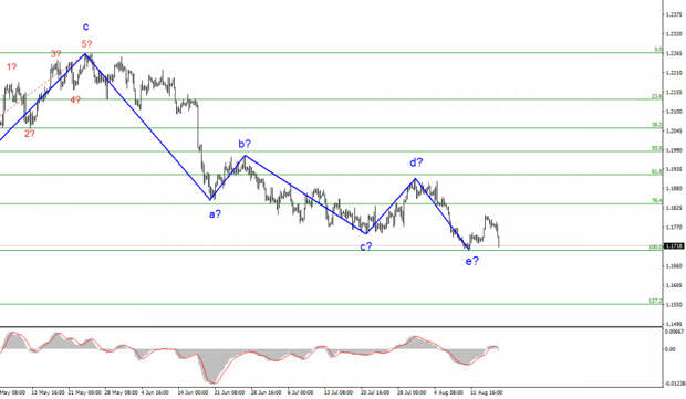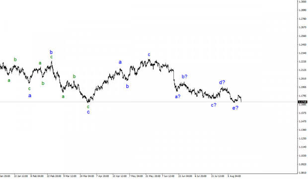 Если это действительно так, то сейчас началось построение предполагаемой волны 5 в e. Таким образом, уже в ближайшее время построение этой волны может завершиться, а инструмент перейти все-таки к построению нового повышательного участка тренда. Уже неудачная попытка прорыва уровня 100,0% по Фибоначчи (вторая по счету) может привести к новому отходу котировок от достигнутых минимумов. Таким образом, я ожидаю перехода инструмента к построению нового восходящего участка тренда и считаю этот вариант наиболее вероятным в данное время. В то же время сильный для американской валюты новостной фон может привести к более значительному усложнению понижательного участка тренда.В течение вторника новостной фон для инструмента Евро/Доллар был довольно интересным, но рынки, к сожалению, не обратили на него должного внимания. Учитывая то, что с открытием рынков в США американская валюта начала сильный рост, можно предположить, что американские отчеты были сильными. Однако в реальности это не так. Начнем с того, что утром вышел отчет по ВВП в Евросоюзе за второй квартал. Нет ничего удивительного в том, что рынки никак не отреагировали на него, так как его значение совершенно не отличалось от предыдущего.