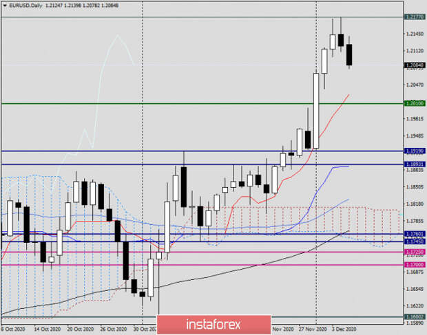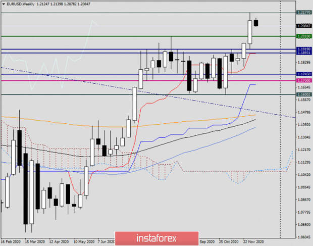 Итак, максимальные значения торгов прошедшей торговой пятидневки были показаны на отметке 1.2177, а цена закрытия последней недельной свечи составила 1.2121. Что же, для евробыков это можно признать достаточно неплохим результатом. Впрочем, учитывая довольно-таки длительную консолидацию в диапазоне цен 1.1600-1.1900, такой выход вверх не является чем-то из ряда вон выходящим. Вполне резонно предположить, что дальнейшее направление EUR/USD будет зависеть в основном от рыночных настроений. Если у инвесторов сохранится оптимизм в отношении скорого начала вакцинации от COVID-19, а также принятия новой программы поддержки ведущей мировой экономики, рисковые настроения продолжат преобладать на мировых финансовых площадках и даже могут усилиться. Также влияния на ход торгов по евро/доллару могут оказать решение ЕЦБ по процентным ставкам и пресс-конференция главы этого ведомства Кристин Лагард, а из американских данных особое внимание инвесторов будет обращено к публикации индекса потребительских цен. Полагаю, что эти события будут для валютной пары eur/usd главными на торгах 7-11 декабря.
