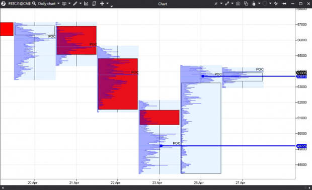 В такой ситуации предсказать даже на несколько дней куда пойдет цена сложно. Поэтому самое лучшее системно торговать и получать прибыль независимо от того растет цена или падает. Рассмотрим уровни максимальных горизонтальных объёмов, с Чикагской фьючерсной биржи. Эти объёмы показывают активность крупных игроков.23.04.21 – Уровень максимального горизонтального объема (РОС – Point Of Control) – 49225