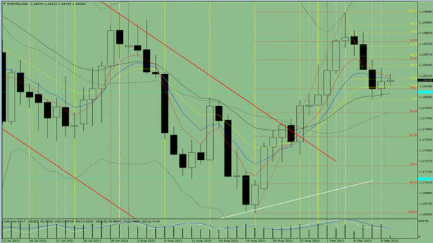 Сегодня цена от уровня 1.1824 (закрытие вчерашней дневной свечи), двигаясь вверх, попытается достичь откатного уровня 38.2%, 1.1842 (жёлтая пунктирная линия). После тестирования данного уровня продолжение движения вверх с целью 1.1855 – откатный уровень 50% (жёлтая пунктирная линия). При тестировании данного уровня возможно продолжение верхней работы.