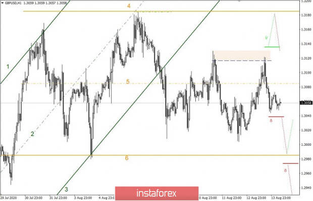 В данном случае рассматривается восходящий ход, где котировке для начала необходимо зафиксироваться выше чем 1,3130, что может привести к последующему движению к линии 4 (район 1,3185).