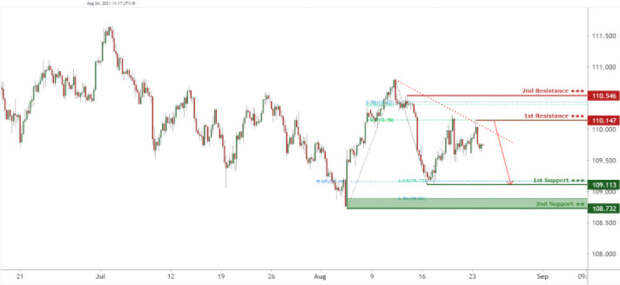 Пара USD/JPY торгуется на линии сопротивления нисходящего тренда. Ожидается, что цена может развернуться к поддержке на уровне 109.113, который соответствует уровню коррекции Фибоначчи 78.6% и уровню расширения Фибоначчи 61.8%. В качестве альтернативы цена может подняться выше первого уровня сопротивления 110.