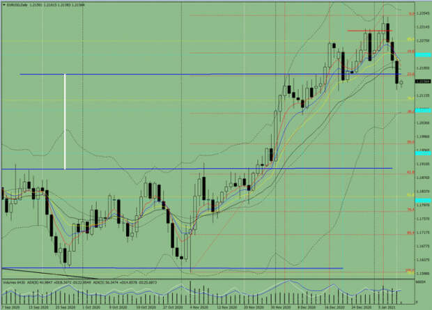 Маловероятный сценарий: цена от уровня 1.2150 (закрытие вчерашней дневной свечи) попытается совершить движение вниз с целью 1.2063 – цена от уровня 1.2150 (закрытие вчерашней дневной свечи) попытается совершить движение вниз с целью 1.2073 – исторический уровень поддержки (голубая пунктирная линия).