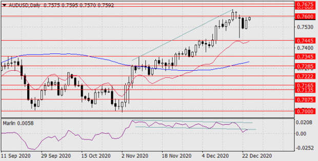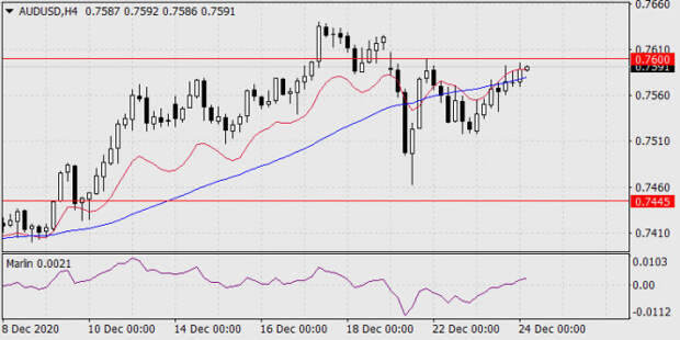 7600, сигнальная линия осциллятора Марлин тестирует снизу нижнюю границу собственного канала. Мы не рассчитываем на закрепление цены над данными техническими уровнями, так как сегодня в Германии и Швейцарии выходной день, а в ряде других европейских стран и в США сокращённый рабочий день. И если у спекулянтов есть желание взять прибыль на тонком рынке, то это удобнее сделать в текущей ситуации путём продаж.На четырёхчасовом графике цена вышла над индикаторную линию Крузенштерна, осциллятор Марлин также чуть проник в зону роста. Но так как впереди сильный технический уровень (0.7600), то решающее влияние оказывает он. В случае разворота цены выход над индикаторные линии будет интерпретироваться как ложный и, соответственно, станет самостоятельным сигналом усиления в случае обратного падения. Ждём развития событий.