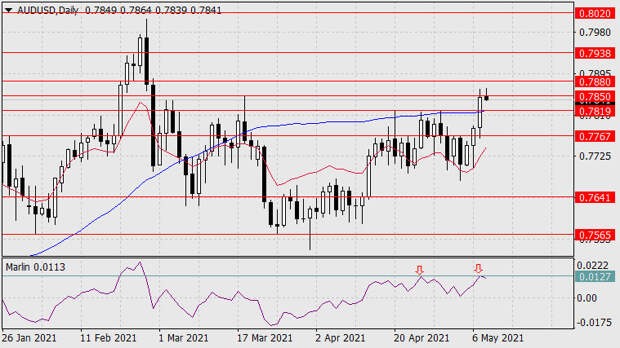 0127), на текущий момент разворачивается от него. Это может быть признаком скрытой (слабой) дивергенции. Закрепление цены под 0.7767 визуально совпадает с моментом перехода Марлина в отрицательную территорию. Если так и произойдёт, то «австралиец» вернётся к среднесрочному понижению.