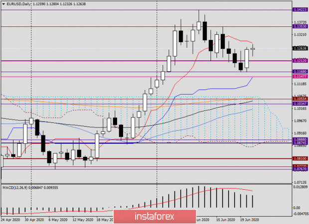 Валютная пара евро/доллар на торгах 22 июня заметно укрепилась и завершила сессию понедельника на 1.1259. Характерно, что пробой уровня поддержки 1.1212 приходится признавать ложным. Под данной отметкой не закрылись три подряд дневные свечи, и вчера пара вернулась выше этого уровня.Сегодня на момент написания данной статьи евро/доллар пытается продолжить укрепление, пара уже обновила вчерашние максимумы на 1.1269 и поднималась до 1.1280. Однако удержаться вблизи данной отметки быкам по евро пока не удаётся. Как представляется важную роль в качестве сопротивления будет выполнять линия Тенкан индикатора Ишимоку, которая проходит на 1.1285. Если сегодняшние торги завершаться выше Тенкан, это придаст дополнительные силы евробыкам и они устремятся к 1.1353. Впрочем, не стоит забывать и о важном техническом уровне 1.1300, который может преградить дальнейшее продвижение курса вверх.