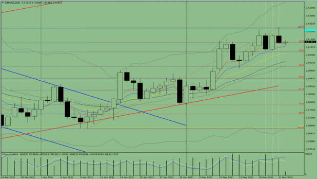 В понедельник рынок от уровня 1.4146 (закрытие пятничной дневной свечи) может начать движение вверх с целью 1.4232 – верхний фрактал (красная пунктирная линия). При тестировании этого уровня возможно продолжение верхней работы с целью 1.4370 – верхняя граница индикатора линии Боллинджера (чёрная пунктирная линия).