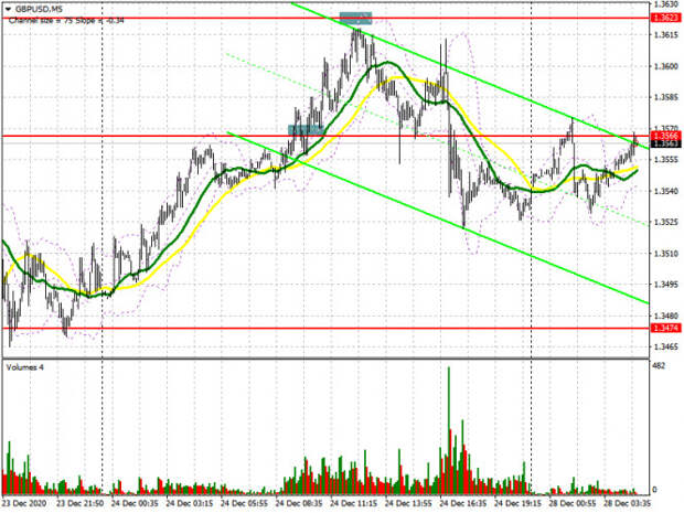 Торговая сделка, заключенная между ЕС и Великобританией в последний момент, не сильно повлияла на фунт, так как все этого ожидали. В четверг было образовано два сигнала по входу в рынок. Давайте посмотрим на 5-ти минутный график и разберем их. В первой половине дня прорыв и закрепление выше уровня 1.