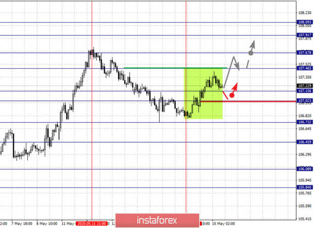 Развития восходящей структуры от 14 мая ожидаем после пробоя 107.46, здесь первая цель – 107.67, возле этого уровня консолидация. Пробой 107.67 должен сопровождаться выраженным восходящим движением, здесь цель – 107.91. Потенциальным значением для верха считаем уровень 108.09, по достижении которого ожидаем откат книзу.
