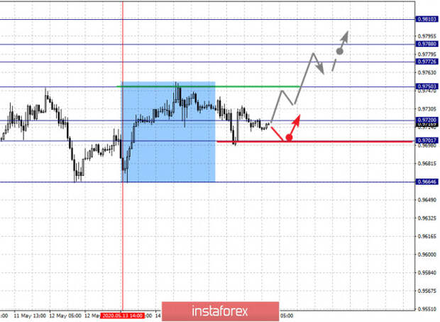 Краткосрочное нисходящее движение возможно в диапазоне 0.9720 – 0.9701, отсюда существует высокая вероятность разворота к верху, пробой уровня 0.9701 будет располагать к развитию нисходящей тенденции, в данном случае потенциальная цель – 0.9664.