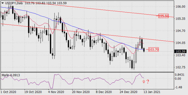 USD/JPYПара USD/JPY так и не смогла преодолеть сопротивление трендовой линии на графике дневного масштаба, отправившись в ожидаемое коррекционное падение. Сигнальная линия осциллятора Марлин приблизилась к границе с территорией «медведей». Возможно, от этой границы Марлин развернётся вверх, указывая на завершение коррекции.