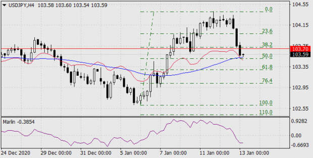 Отработка ценой линии Крузенштерна произойдёт в точности на уровне Фибоначчи 50,0%, что создаёт хорошую возможность цене оттолкнуться от этой поддержки и выйти обратно над 103.70, то есть над линию Крузенштерна дневного тайма. Ждём развития событий, сегодня ситуация по йене не торговая.