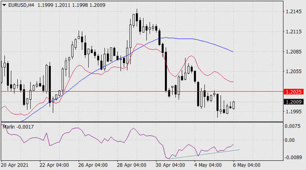 На графике четырёхчасового масштаба сформировалась уже двойная конвергенция. Возможно, цена сегодня ещё продолжит боковое движение. Ограничителем сверху выступает уровень Фибоначчи 50,0% на цене 1.2025. Целью «медведей» на ближайшие дни выступает уровень Фибоначчи 23,6% на уровне 1.1856.