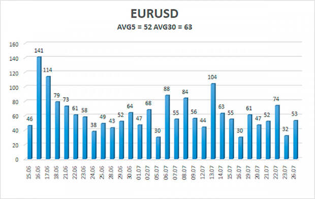 Волатильность валютной пары евро/доллар по состоянию на 27 июля составляет 52 пункта и характеризуется, как «средняя». Таким образом, мы ожидаем движение пары сегодня между уровнями 1,1759 и 1,1863. Разворот индикатора Хайкен Аши вниз просигнализирует о новом витке нисходящего движения.