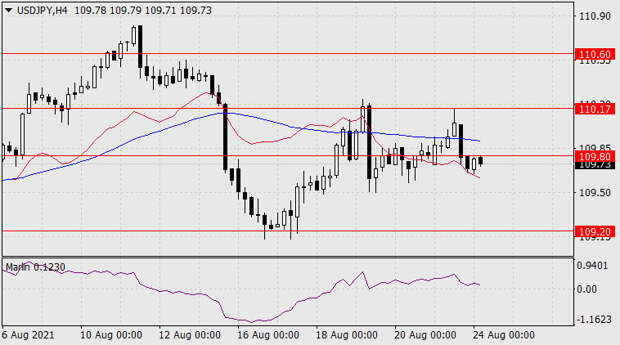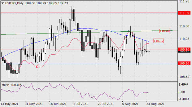На графике четырёхчасового масштаба осциллятор Марлин удерживается на территории растущей тенденции. Цена выше индикаторной линии баланса, но ниже линии Крузенштерна. Здесь также цене не помешает создать консолидацию в диапазоне между уровнем 109.80 и линией Крузенштерна для последующего успешного преодоления мешающих сопротивлений. Если, однако, консолидация сформируется под уровнем 109.80, то возможен возврат цены к ранней поддержке 109.20.