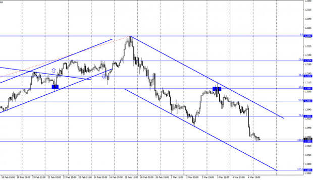 Добрый день, уважаемые трейдеры! Пара EUR/USD 4 марта выполнила новый разворот в пользу американской валюты и продолжила процесс падения, оказавшись в итоге сегодня утром около уровня коррекции 100,0% - 1,1952. Отбой курса пары от этого уровня сработает в пользу валюты ЕС и некоторого роста в направлении уровня Фибо 76,4% - 1,2021.