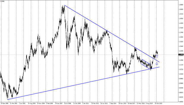 На недельном графике пара EUR/USD выполнила закрепление над «сужающимся треугольником», что сохраняет перспективы дальнейшего роста пары в долгосрочной перспективе.