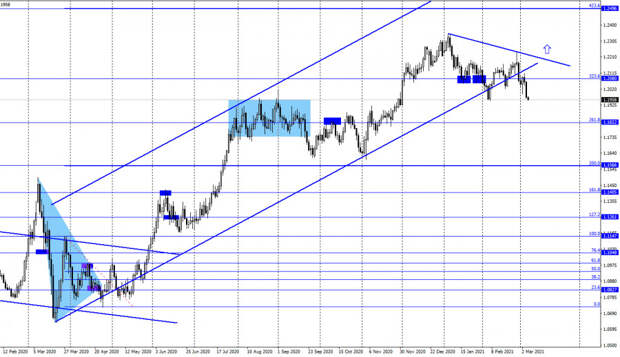 Закрытие пары под уровнем 100,0% повысит вероятность дальнейшего падения в направлении следующего коррекционного уровня 127,2% - 1,1873. Нисходящий трендовый коридор по-прежнему характеризует настроение трейдеров, как «медвежье». В течение вчерашнего дня в Евросоюзе и в США вышло несколько довольно интересных отчетов. Например, в Европе стало известно о сильном сокращении розничной торговли по итогам января. Падение составило 5,9% м/м. В США вышел отчет по заявкам на пособия по безработице, но он оказался не интересным, так как их количество практически идеально точно совпало с ожиданиями трейдеров. Таким образом, до самого вечера трейдеры не спешили заходить в рынок и явно ждали выступления Джерома Пауэлла. Я уже говорили в предыдущих статьях, что темой номер один для рынков сейчас остается тема доходности государственных облигаций США, которая очень сильно растет в последнее время. Таким образом, от Пауэлла ждали разъяснений относительно будущей инфляции, которая, как все опасаются и инвесторы в том числе, может значительно вырасти, перекрыв доход по текущей доходности облигаций. Именно поэтому спрос на трежерис остается низким, а их доходность растет, что совершенно не выгодно государству. Пауэлл отметил, что ФРС рассчитывает удерживать инфляцию в случае ее роста около 2% до тех пор, пока рынок труда полностью не восстановится. Однако и признал, что ее уровень может достигать и более высокого значения. Таким образом, Пауэлл косвенно подтвердил, что инфляция будет расти и, возможно, даже выше 2%. А как ее сдерживать будет ФРС, пока не ясно. На этом фоне доходность десятилетних гособлигаций опять выросла и составила 1,576%.EUR/USD – 4H.