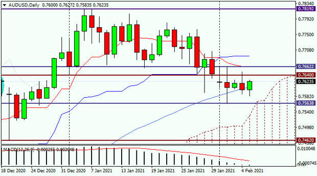 На дневном графике ситуация более не менее ясна. После появления свечи с длинными тенями за 2 февраля, пара так и торгуется в диапазоне 0.7662-0.7563. Характерно, что верхнюю границу данного диапазона усиливает красная линия Тенкан, поэтому продажи после подъёма в область 0.7660 выглядят довольно-таки привлекательной торговой идеей. Тем более что доллар США в последнее время демонстрирует склонность к укреплению. Пока остановимся на этом, а также дождёмся релизов по американскому рынку труда. Полагаю, что после закрытия текущей торговой пятидневки, ситуация станет более понятной.