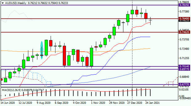 Как предполагают в РБА, в текущем и следующем годах австралийская экономика продемонстрирует рост на 3.5%. При таком сценарии уровень безработицы к 2023 году снизится до 5.25%, а инфляционный рост составит 1.75%. Впрочем, как отмечают в банке, многое будет зависеть от вакцинации против COVID-19. Если этот процесс будет протекать благоприятно и у населения страны выработается коллективный иммунитет к коронавирусной инфекции, то к завершению 2022 года безработица может опуститься к уровню 4.75%. Что касается инфляционных перспектив, то рост будет немного более быстрым, однако до целевого уровня РБА в 2% инфляция всё равно не доберётся. Также напомню, что на своём последнем заседании австралийский Центробанк принял решение сохранить ключевую процентную ставку на рекордно низком уровне 0.10%, но при этом расширил программу скупки активов ещё на сто миллиардов австралийских долларов. Ну что же, настало время переходить к рассмотрению графиков цены aud/usd, и для полноты картины, а также понимания всего происходящего, обратим свой взор на недельный таймфрейм.Еженедельно