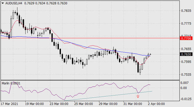 На четырёхчасовом графике конвергенция выражена более заметно, но её второе дно (отмечено стрелкой) расположено очень близко к нулевой линии осциллятора, что также является признаком слабости формации, а сама сигнальная линия уже показывает намерение развернуться вниз. Цена достигла индикаторную линию Крузенштерна, теперь может любым образом совершать в её ближайшей области любые движения вплоть до выхода американских данных по труду. Ждём этих данных.Наш основной сценарий предполагает снижение цены на оптимистичных данных и последующую отработку целей 0.7500 и 0.7375.
