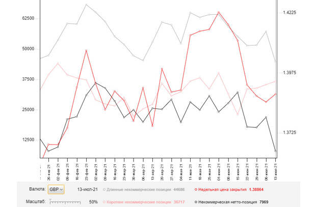 В COT отчетах (Commitment of Traders) за 13 июля зафиксировано резкое сокращение длинных позиций и небольшое увеличение коротких. Это говорит о том, что инфляция в Соединенных Штатах Америки все же повлияла на настроения покупателей фунта в негативную сторону. Тот факт, что представители Банка Англии в последнее время неохотно говорят о планах по сокращению программы покупки облигаций, еще раз доказывает их осторожную позицию в этом вопросе. 19 июля этого года правительство Великобритании полностью отменило все карантинные ограничения, но по последним цифрам о заболеваемости в стране новым штаммом коронавируса «Дельта» – это ненадолго. Несомненно, после каждого крупного движения GBP/USD вниз трейдеры проявляют особый интерес, так как рано или поздно в центральном банке заговорят о сворачивании мер поддержки экономике, что окажет положительное влияние на британский фунт и приведет к его росту. Но пока серьезного выхода за пределы целевого уровня инфляции в Великобритании не произошло, вряд ли в Банке Англии будут торопиться с внесением изменений в свою политику. Несмотря на это, оптимальным сценарием остаются покупки фунта при каждом хорошем снижении в паре с долларом США. В COT отчете указано, что длинные некоммерческие позиции сократились с уровня 57 232 до уровня 44 686, в то время как короткие некоммерческие позиции выросли с уровня 35 329 до уровня 36 717. В результате некоммерческая нетто-позиция сократилась и составила 7 969 против 21 903. Цена закрытия прошлой недели немного выросла и составила 1.3886 против 1.3853.