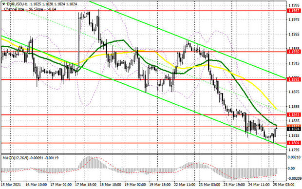 Они будут серьезно ограничивать восходящий потенциал пары. Основной целью быков после пробоя сопротивления 1.1843 станет возврата на уровень 1.1892, где рекомендую фиксировать прибыль. Если активность покупателей во время теста 1.1843 иссякнет, а давление на евро вернется в первой половине дня – рекомендую открывать длинные позиции лишь при формировании ложного пробоя в области поддержки 1.1804, которая уже была сегодня протестирована в ходе азиатской сессии. Покупать евро сразу на отскок советую только от более крупного минимума 1.1760 в расчете на отскок в 20-25 пунктов внутри дня.Для открытия коротких позиций по EURUSD требуется: