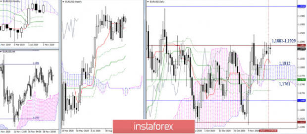 Близится завершение очередной рабочей недели. Евро провела её в раздумьях и ожиданиях. Диапазон движения небольшой, результат пока отсутствует и у игроков на повышение, и у соперника. Основная зона сопротивлений, о которую на этой неделе сломано немало копий, сохраняет своё расположение и значение на 1,1881 – 1,1929 (исторический уровень + 100% отработка цели на пробой облака Н4).