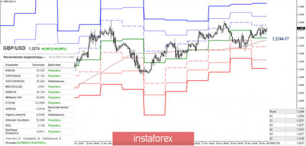 В настоящий момент игроки на повышение сохраняют преимущества на младших таймах. Сопротивления классических Пивот-уровней расположены сейчас на 1,3294 – 1,3327 – 1,3377. К изменению ситуации приведёт потеря ключевых поддержек младших таймов, которые сегодня объединились в районе 1,3244-37 (центральный Пивот-уровень + недельная долгосрочная тенденция). Чтобы медведям добиться надёжного перевеса сил им нужно завладеть мувингом и развернуть его.