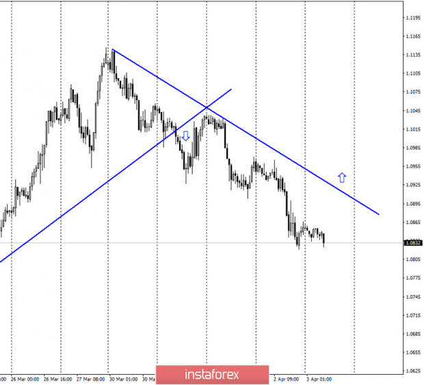 Добрый день, уважаемые трейдеры! На часовом графике все проходит по плану. Новая нисходящая линия тренда четко указывает на «медвежье» настроение большинства трейдеров. Таким образом, продавать пару можно будет до закрытия котировок над этой самой линией тренда. В целом же пара EUR/USD продолжает процесс падения 3 апреля.