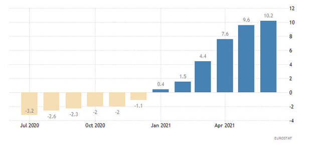 Сегодня же единая европейская валюта может оказаться под серьезнейшим давлением по причине ожидаемого роста индекса цен производителей, с 10,2% до 11,0%. Инфляция в Европе и так недавно резко подскочила, а стремительный рост цен производителей намекает на ее дальнейший рост.