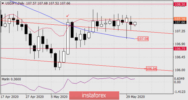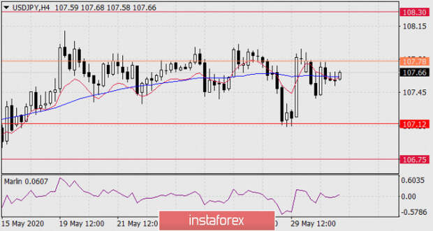 Цель 108.30.На четырёхчасовом графике цена на текущий момент преодолевает сопротивление индикаторной линии Крузенштерна (голубая линия), сигнальная линия осциллятора Марлин входит в зону положительных значений – в зону роста тенденции. Терпеливо ждём роста цены.