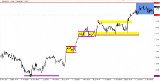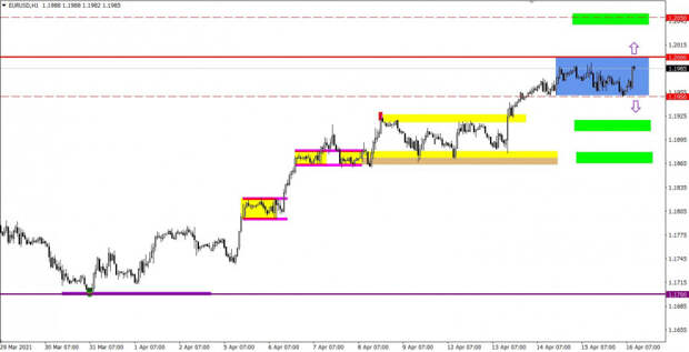 Торговая рекомендация от 15 апреля рассматривала процесс колебания в рамках 1,1950/1,2000 как точку начала в предстоящем ускорении, но вход в сделку должен был осуществиться только в момент выхода цены из установленных границ.