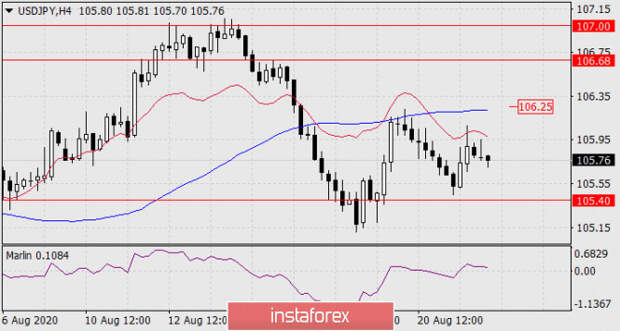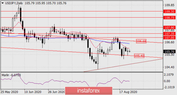 USD/JPY В прошедшую пятницу йена проторговалась в диапазоне, ограниченному снизу вложенной линией ценового канала, а сверху индикаторной линией баланса на графике дневного масштаба. Сигнальная линия осциллятора Марлин пытается перейти в зону роста.