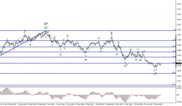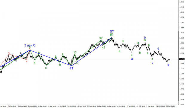 Волновая разметка 4-часового графика по-прежнему является вполне однозначной и выглядит вполне понятно. На данный момент структура волн a-b-c-d-e выглядит полностью укомплектованной и полноценной. Однако за последние дни появился альтернативный вариант, исходя из которого участок тренда, берущий свое начало 25 февраля (где сейчас расположен пик волны b), может быть третьей волной с, которая приняла трехволновой вид, где каждая внутренняя волна также имеет трехволновой вид. На подобное предположение меня натолкнуло несоответствие между размерами первых волн нисходящего участка тренда и предполагаемых последних.