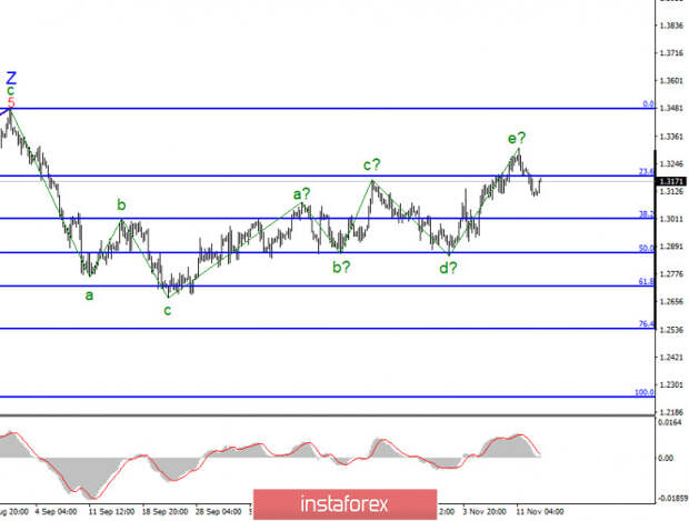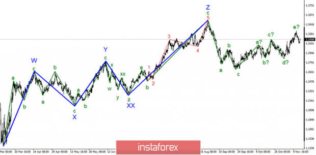 В наиболее глобальном плане построение восходящего участка тренда продолжается, однако вся волновая разметка принимает сложный вид. Участок тренда, берущий свое начало 23 сентября, принял пятиволновой вид, однако при этом не импульсный и при этом может быть уже завершен. Таким образом, уже могло начаться построение нового трехволнового участка тренда, а может быть, и более сложной нисходящей структуры волн.