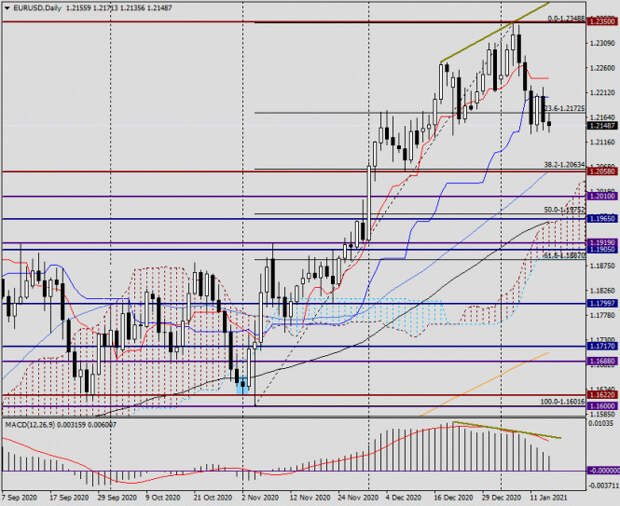 А в это время некоторые аналитические департаменты крупных мировых коммерческих банков продолжают утверждать, что рост единой европейской валюты против доллара США будет недолгим и достаточно ограниченным. По личному же мнению автора данной статьи, если EUR/USD и продолжит восходящий тренд, то его целью в среднесрочной перспективе станет область 1.2460-1.2520. При наиболее благоприятном сценарии для евробыков пара может подняться в район 1.2700, однако для этого должен совпасть ряд факторов в пользу единой европейской валюты. Это и ситуация в Соединённых Штатах Америки с вступлением в должность избранного президента Джо Байдена, а точнее его первые шаги, и выполнение обещания по широкомасштабной поддержке ведущей мировой экономики, а также ситуация с вакцинацией населения от пандемии COVID-19, которая проходит пока отнюдь не так гладко, как планировалось изначально.Также своё влияние на ценовую динамику евро/доллара может оказать кривая доходности европейских и американских облигаций, а также дальнейшие шаги в монетарной политике ЕЦБ и ФРС. Вполне возможно, что бюджетное стимулирование в США после первоначальной эйфории, оптимизма и аппетита к рискам сменится в пользу укрепления американской валюты.