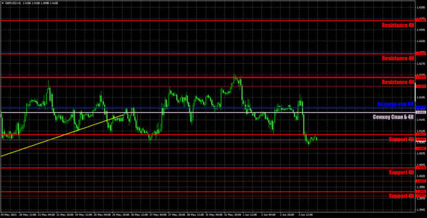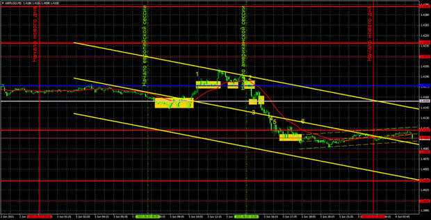 Однако на европейской торговой сессии пара, наоборот, торговалась с повышением, а на британскую статистику никак не отреагировала. Более того, цена с удовольствием формировала ложные сигналы в течение дня. Давайте разбираться с этими сложными торгами в четверг. Первый сигнал или его подобие сформировался около линии Сенкоу Спан Б. Однако, честно говоря, на сигнал это было не очень похоже. Цена и не отскочила, и не преодолела эту линию и торговалась вдоль нее в течение почти трех часов. Так что этот «сигнал» можно было игнорировать. Далее последовал не менее «прекрасный» сигнал около критической линии, но здесь хотя бы цена четко преодолела линию, поэтому открывать длинные позиции следовало, даже несмотря на публикацию в Великобритании индексов деловой активности, на которые пара отреагировала ростом пунктов на 10. Этот сигнал на покупку оказался ложным, однако цена долгое время не могла закрыться ниже критической линии, поэтому трейдеры должны были вручную закрывать сделку перед началом американской сессии, когда была запланирована публикация целого ряда отчетов. На тот момент еще никто не знал, насколько сильной получится статистика, а цена все время норовила закрыться обратно ниже критической линии. Цифры «2» и «3» показывают время публикаций отчетов от ADP и по количеству новых заявок на пособия по безработице. Именно в это время и были сформированы еще два сигнала около линий Киджун-сен и Сенкоу Спан Б, которые следовало отфильтровывать, так как цена могла двинуться в любую сторону. А вот следующий сигнал на продажу в виде преодоления линии Сенкоу Спан Б уже можно было отрабатывать короткой позицией, которая принесла от 32 до 43 пунктов прибыли, в зависимости от того, где была закрыта сделка, около уровня 1,4112 или 1,4101. От уровня 1,4101 изначально последовал отскок, однако отрабатывать этот сигнал уже явно не следовало, так как через час началось выступление Эндрю Бейли, а дело уже близилось к вечеру. Не самый удачный день для торговли, много событий и сигналов, но все же удалось получить небольшую прибыль.Обзор пары EUR/USD. 4 июня. Бежевая книга показала оптимизм всех 12 ФРБ США. Сомнения только в темпах восстановления рынка труда.