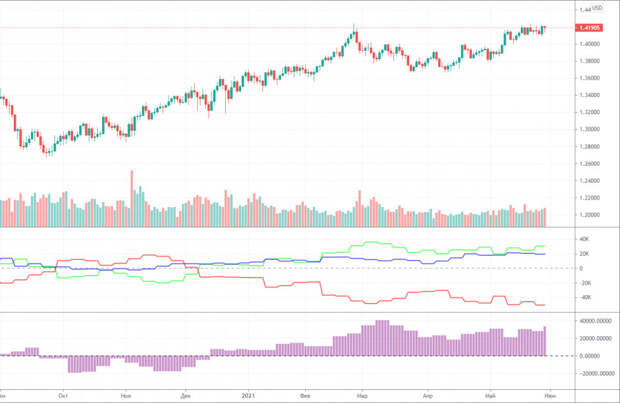 Напомним, что в течение последней отчетной недели(18 – 24 мая) пара GBP/USD повысилась на 10 пунктов(а неделей ранее – понизилась на 10 пунктов). Однако, в целом фунт стерлингов продолжает дорожать, что видно невооруженным глазом на любом долгосрочном таймфрейме. Крупные игроки рынка продолжают в целом наращивать ордера на покупку, что оказывает дополнительный стимул британской валюте. На отчетной неделе группа трейдеров «Non-commercial»(напомним, наиболее важная группа) открыла всего 936 контрактов Buy, но при этом закрыла 4,7 тысячи контрактов Sell. Таким образом, нетто-позиция опять увеличилась, более, чем на 5 тысяч контрактов, что для фунта значит гораздо больше, чем для евровалюты. Настроение профессиональных трейдеров вновь стало немного более «бычьим», но при этом в среднесрочной перспективе абсолютно нельзя сказать, что крупные игроки постоянно наращивают лонги или закрывают шорты. Второй индикатор на иллюстрации выше, который отображает изменение нетто-позиции для группы трейдеров «Non-commercial» показывает, что активное наращивание лонгов крупными игроками началось примерно в феврале, но уже к середине марта их количество начало сокращаться, а с начала апреля находится приблизительно на одном и том же уровне. Таким образом, фунт стерлингов продолжает дорожать совершенно несоразмерно «бычьему» настроению некоммерческих трейдеров. Поэтому мы продолжаем считать, что на пару гораздо большее влияние оказывает фактор вливания в американскую экономики сотней миллиардов и триллионов долларов, чем действия крупных игроков рынка. Однако, вероятнее всего эффект от этих двух факторов перемножается между собой, что приводит к еще более сильному результату. В нашем случае, фунт стерлингов продолжает рост тогда, когда должен был бы падать к 30 фигуре, если бы фундаментальный фон из Великобритании хоть немного учитывался.