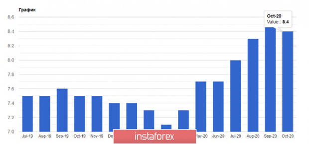 Поддерживают европейскую валюту и сегодняшние отчеты по еврозоне. Данные о том, что уровень безработицы в еврозоне в октябре этого года снизился, а не вырос, удивил трейдеров, что является хорошим знаком для европейской экономики. Пока новые карантинные меры не привели к возникновению трудностей на рынке труда, особенно при условии действия ряда программ поддержки населения ЕС. По данным бюро статистики Eurostat, число безработных в 19 странах ЕС в октябре сократилось на 86 000, а сам уровень безработицы упал до 8,4% с 8,5% в предыдущем месяце. Как я отмечал выше, реальная картина уровня безработицы в еврозоне до конца неизвестна, так как программы субсидирования заработных плат, которые покрывают значительную часть издержек бизнеса, позволяют многим нанимателям оставлять работников в своих штатах.