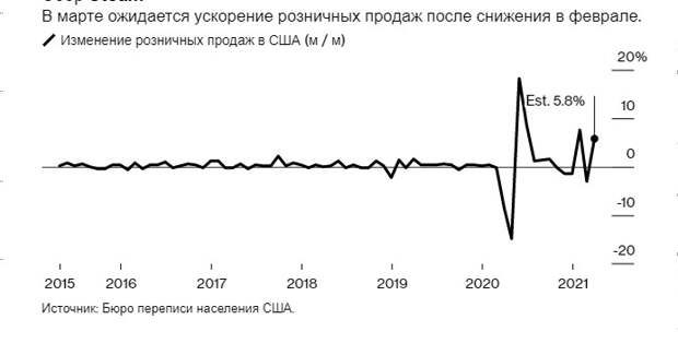 Не забывайте, что сегодня нас ждет достаточно важный отчет по объему розничных продаж в США, который может послужить катализатором для формирования крупной нисходящей коррекции в EURUSD. Вероятней всего розничные продажи в США выросли в марте этого года благодаря более быстрому найму, распределению стимулирующих чеков, стабильным темпам вакцинации против Covid-19 и снятием ряда ограничений на работу магазинов по всей стране. В сегодняшнем отчете Министерства торговли розничные продажи могут подскочить сразу на 5,8%, после снижения на 3% в феврале. Есть и такие экономисты, которые прогнозируют рост как минимум на 10%. В Bank of America Corp. и вовсе ожидают скачек на 11,5%. Основной упор в росте показателя делается на то, что в начале марта личные доходы американцев демонстрировали резкий рост за счет выдачи стимулирующих чеков на сумму 1400 долларов. Кроме того, в прошлом месяце на рынке труда появилось более 900 000 рабочих мест, что также может привести к значительному росту розничных продаж.