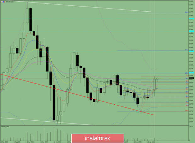 Маловероятный сценарий: от уровня 1.0993 – верхний фрактал (синяя пунктирная линия) работа вверх с целью 1.1032 – верхняя граница индикатора линии Боллинджера (фиолетовая пунктирная линия).