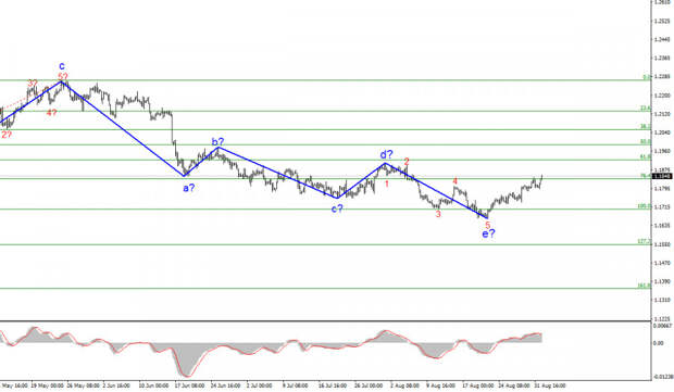 Его внутренняя волновая разметка выглядит вполне убедительно. Волновая разметка предполагаемой волны e также выглядит весьма убедительно. Таким образом, по моему мнению, все-таки началось построение нового повышательного участка тренда, который также может получиться коррекционным. Пока что речь идет о построении трех волнового участка тренда. Если это предположение верно, то первая волна может получиться весьма протяженной (можно сравнить с нисходящими волнами предыдущего нисходящего участка). А конечная цель будет лежать около максимума предыдущего повышательного участка тренда, то есть около отметки 1,2266. Вариант с усложнением нисходящего набора волна я пока не рассматриваю.В течение среды новостной фон для инструмента Евро/Доллар был уже достаточно сильным. Еще утром в Евросоюзе вышли отчеты по безработице и деловой активности в производственном секторе. Выяснилось, что уровень безработицы снизился на 0,2% и составил 7,6% в июле. Деловая активность в секторе производства снизилась всего на 0,1 пункта и составила в августе 61,5. Таким образом, отчеты из Европы нельзя назвать слабыми. Спрос на европейскую валюту утром оставался невысоким, но стабильным. Во второй половине дня вышел отчет ADP по изменению числа занятых в экономике США.