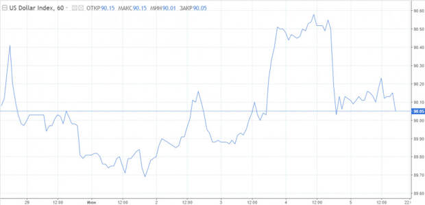 По индексу доллара сохраняется негативный тренд. Как мы видим, ему так и не удалось развить импульс роста выше 90,60. В начале новой недели индикатор торгуется без выраженного направления у нижней границы текущего диапазона. Если давление на «американца» усилится, в игру вступит важная область 90 пунктов. При пробитии вниз этой отметки валюта США вернется к майским минимумам в районе 89,50.