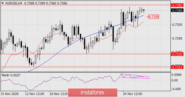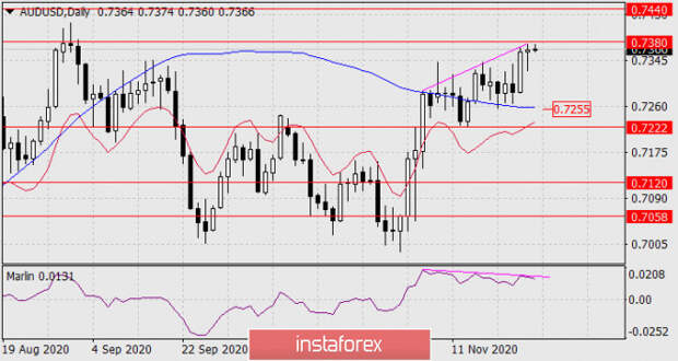 Потенциал к формированию дивергенции на дневном графике сохраняется, уровень 0.7380 не преодолён, но вероятность этого повысилась. Целью в этом случае выступает уровень 0.7440.