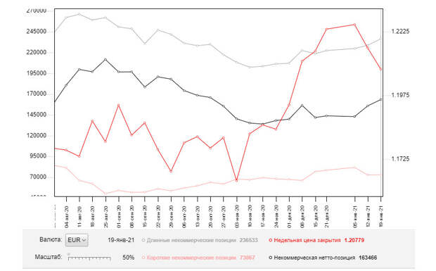 Напомню, что в COT отчете (Commitment of Traders) за 19 января был зафиксирован резкий рост длинных позиций и небольшое увеличение коротких. Несмотря на все поступающие фундаментальные данные и сохранение целого ряда карантинных ограничений до февраля этого года во многих европейских странах, покупатели рисковых активов продолжают верить в бычий тренд. Особенно спрос появляется при каждой существенной нисходящей коррекции с максимумов этого года, что позволяет войти в рынок новым крупным игрокам. Перебои с вакцинацией в Европе не дают покупателям рисковых активов наращивать свои позиции более активно, как и слабые фундаментальные показатели еврозоны. Однако перспектива отмена карантина явно сохранят в рынке позитивные настроения. Сдерживающим фактором роста евро по-прежнему является риск продления карантинных мер в феврале этого года. В COT отчете указано, что длинные некоммерческие позиции выросли с уровня 228 757 до уровня 236 533, в то время как короткие некоммерческие позиции увеличились лишь с уровня 72 867 до уровня 73 067. Из-за резкого роста длинных позиций общая некоммерческая нетто-позиция выросла до уровня 163 466 против 155 890 неделей ранее.