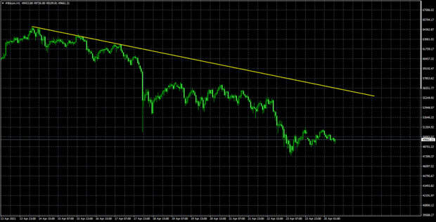 Взглянем на часовой таймфрейм, который мы уже приводили в последних статьях. Здесь имеется четкая нисходящая линия тренда, которая показывает, что нисходящая тенденция уже сформировалась и на данный момент сохраняется. На этих выходных котировки торгуются в весьма узком для себя диапазоне 48 700 – 51 000$. А продавцам по-прежнему нужно удерживать «цифровое золото» ниже приблизительно уровня 56 500$, который расположен очень далеко.